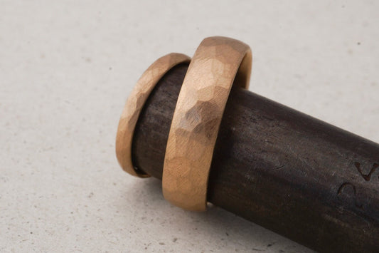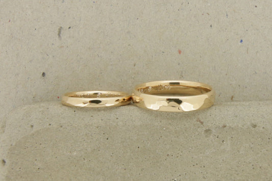 Roségold und Gelbgold, recyceltes Gold, gehämmerte Eheringe handgefertigt