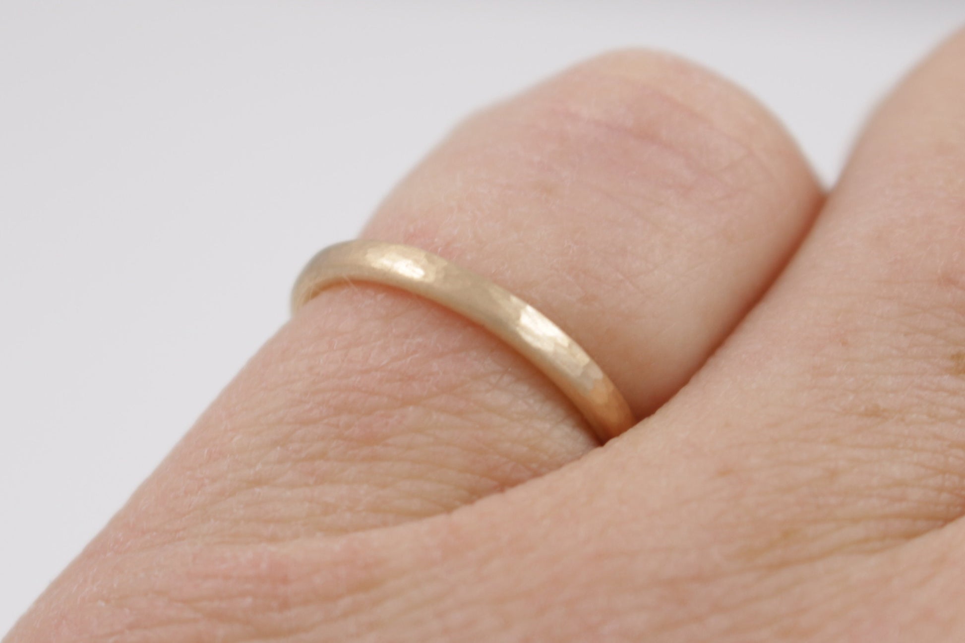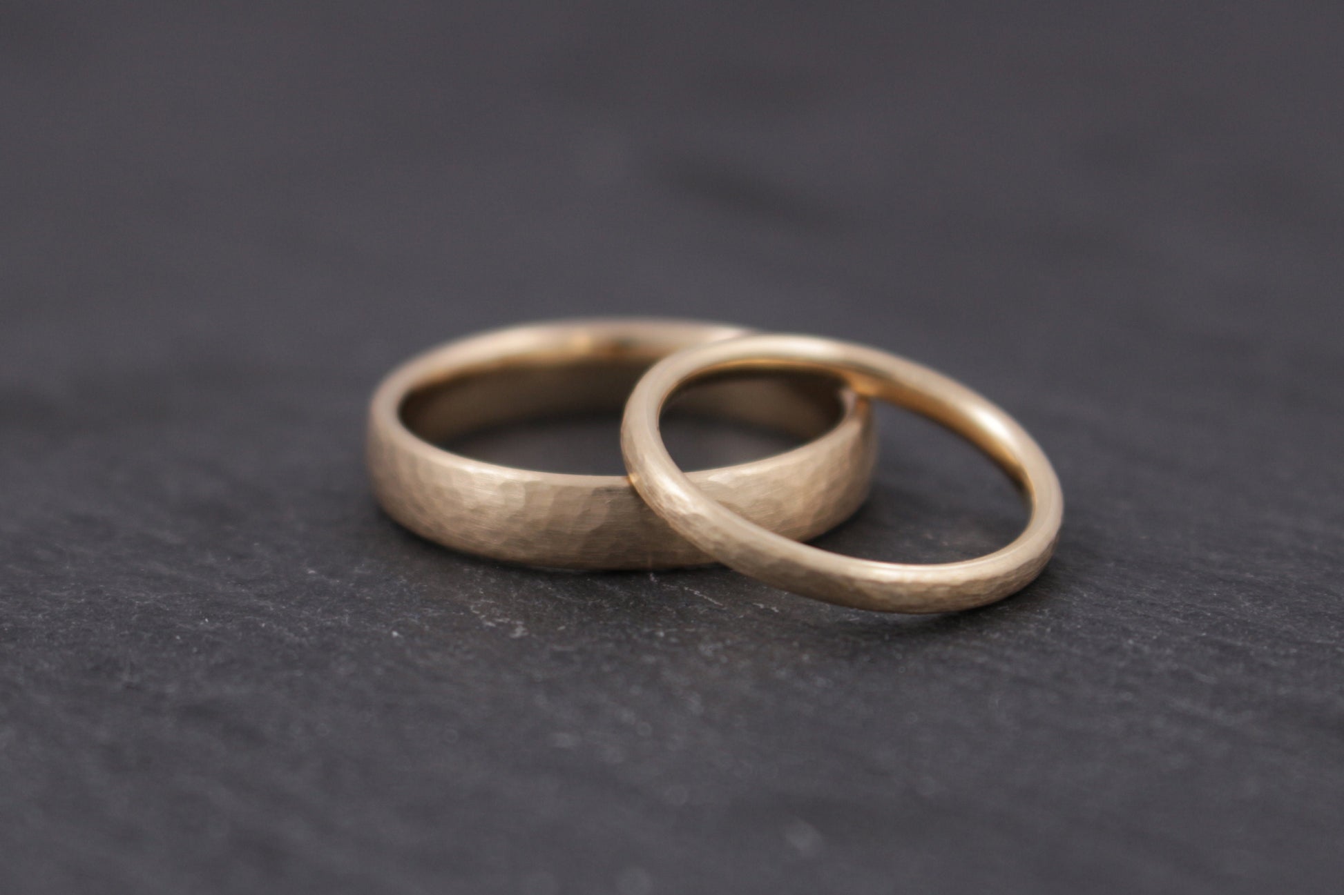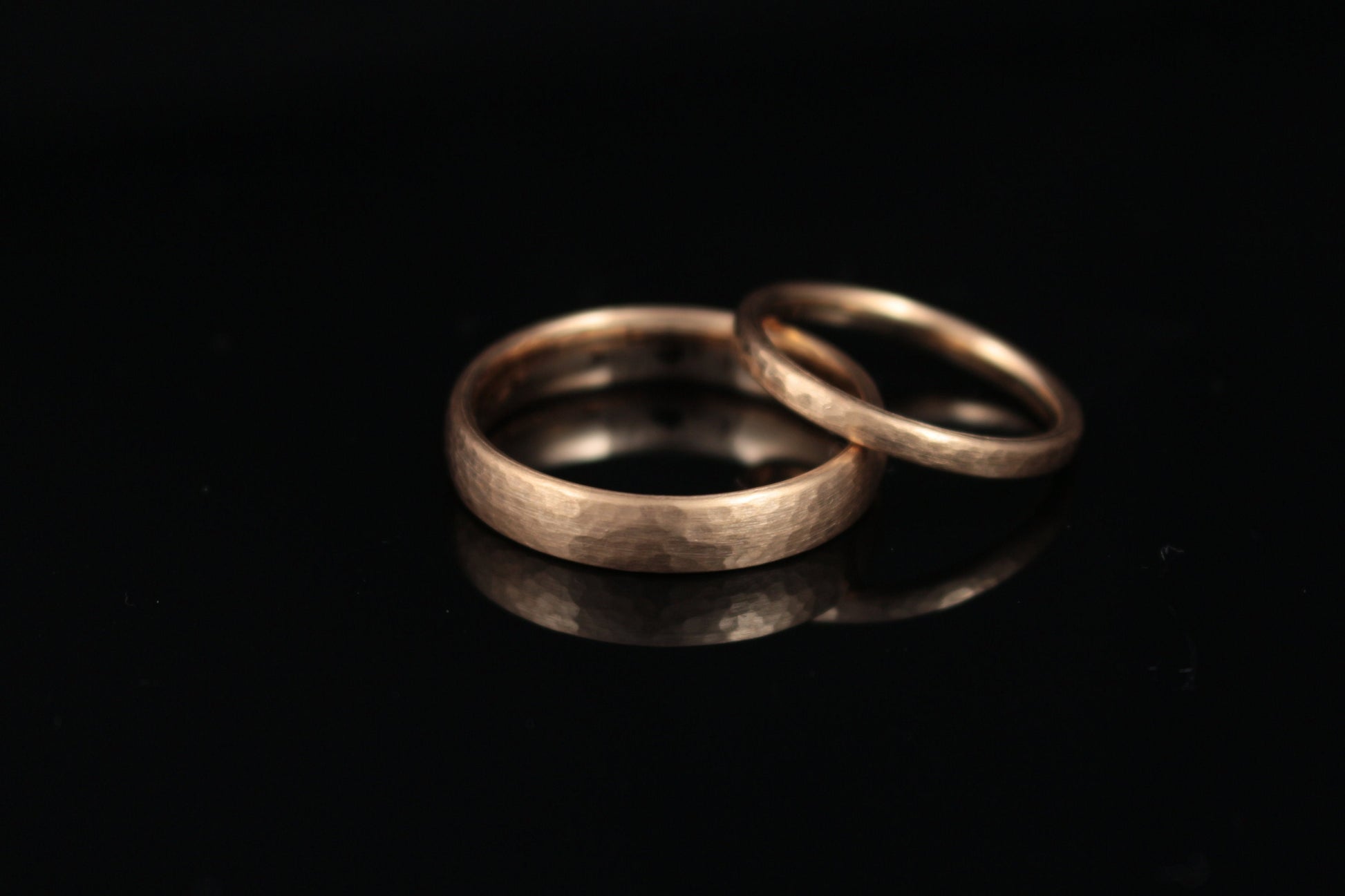 Der Klassiker mit dem gewissen Etwas. Ein Paar Eheringe aus Rosegold mit kräftigem aber feinem Hammerschlag. Die abgebildeten Ringe haben eine Breite von 2 mm und 5 mm. Die Materialstärken liegen bei 1,3 mm und 1,8 mm.